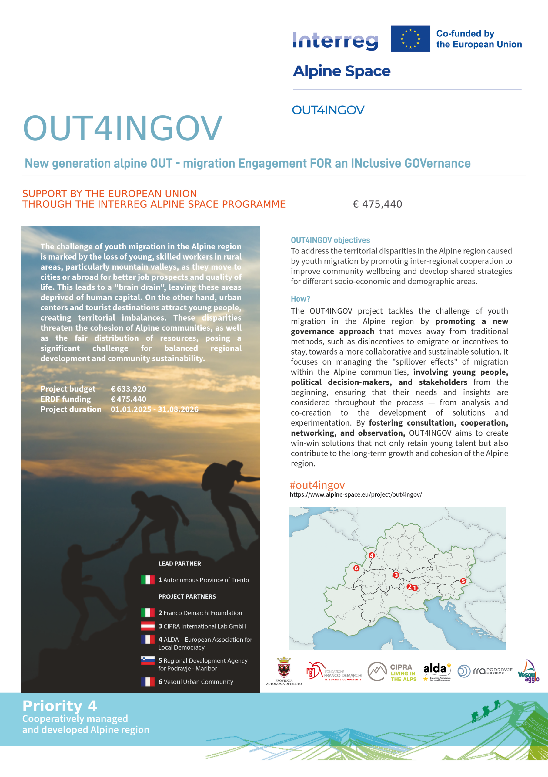 The project aims to innovate policies on youth migration and strengthen territorial cohesion through co-creation with stakeholders. It seeks to develop shared governance models, build the capacity of local actors, and empower communities. Central to its approach is the involvement of young people, particularly migrants, through initiatives such as youth councils. By fostering skill transfer, community networks, and collaborative projects, the project envisions long-term positive impacts, including a triple-win scenario benefiting sending areas, receiving regions, and young migrants themselves. With a strong focus on transnational collaboration, OUT4INGOV highlights the necessity of addressing these challenges across borders to ensure cohesive development. Its innovative approach, combining policy rationalisation, co-creation, and youth engagement, sets the foundation for sustainable solutions to migration and governance issues in the Alpine region. The project is planned for a duration of 20 months. The total budget of the project amounts to €633,920, of which €475,440 is funded by the ERDF.